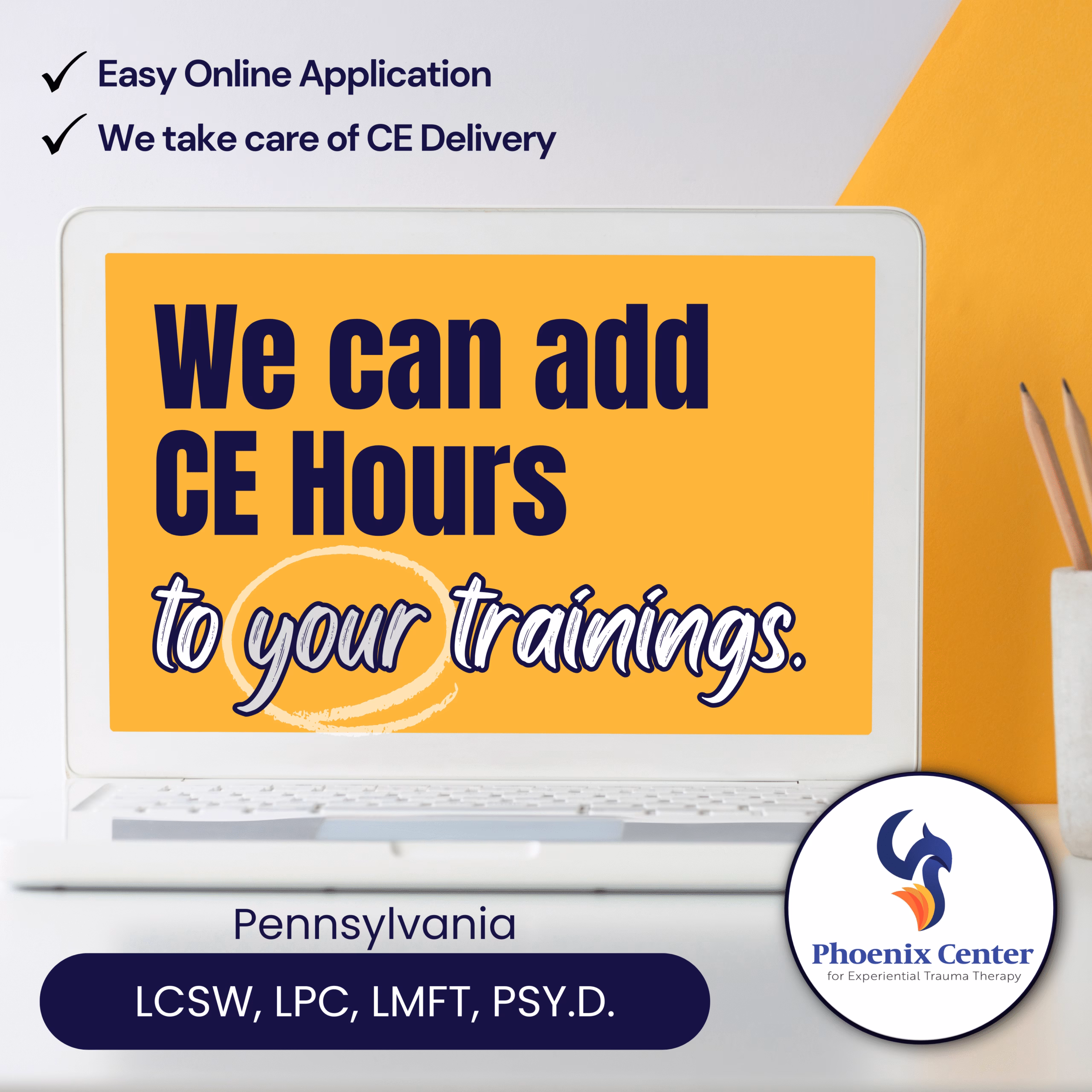 We can help! The Phoenix Center for Experiential Trauma Therapy has been pre-approved as a provider of professional continuing education (CEs) in Pennsylvania for psychologists, social workers, marriage and family therapists, and professional counselors.